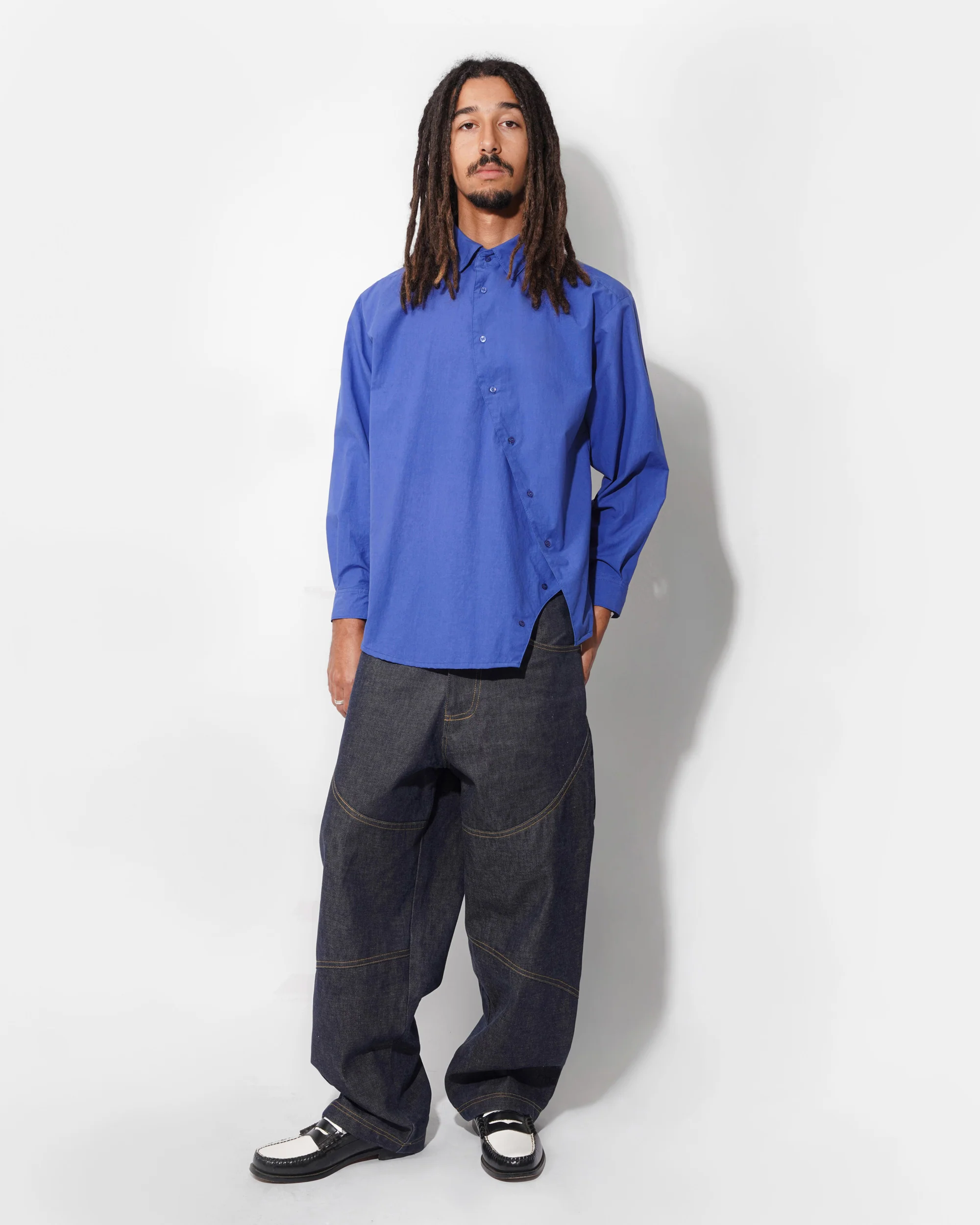 An Ella Mae take on an everyday classic, the Cosmo Button Down features a relaxed fit with asymmetrical buttons. The placket moves diagonally across the body of the shirt and ends with a small arch-shaped opening at the hem, adding a touch of whimsy to this wardrobe staple. Wear it buttoned all the way up, halfway buttoned, or fully open for maximum drape. Crafted in a beautifully washed bright lapis blue cotton with a bit of structure.