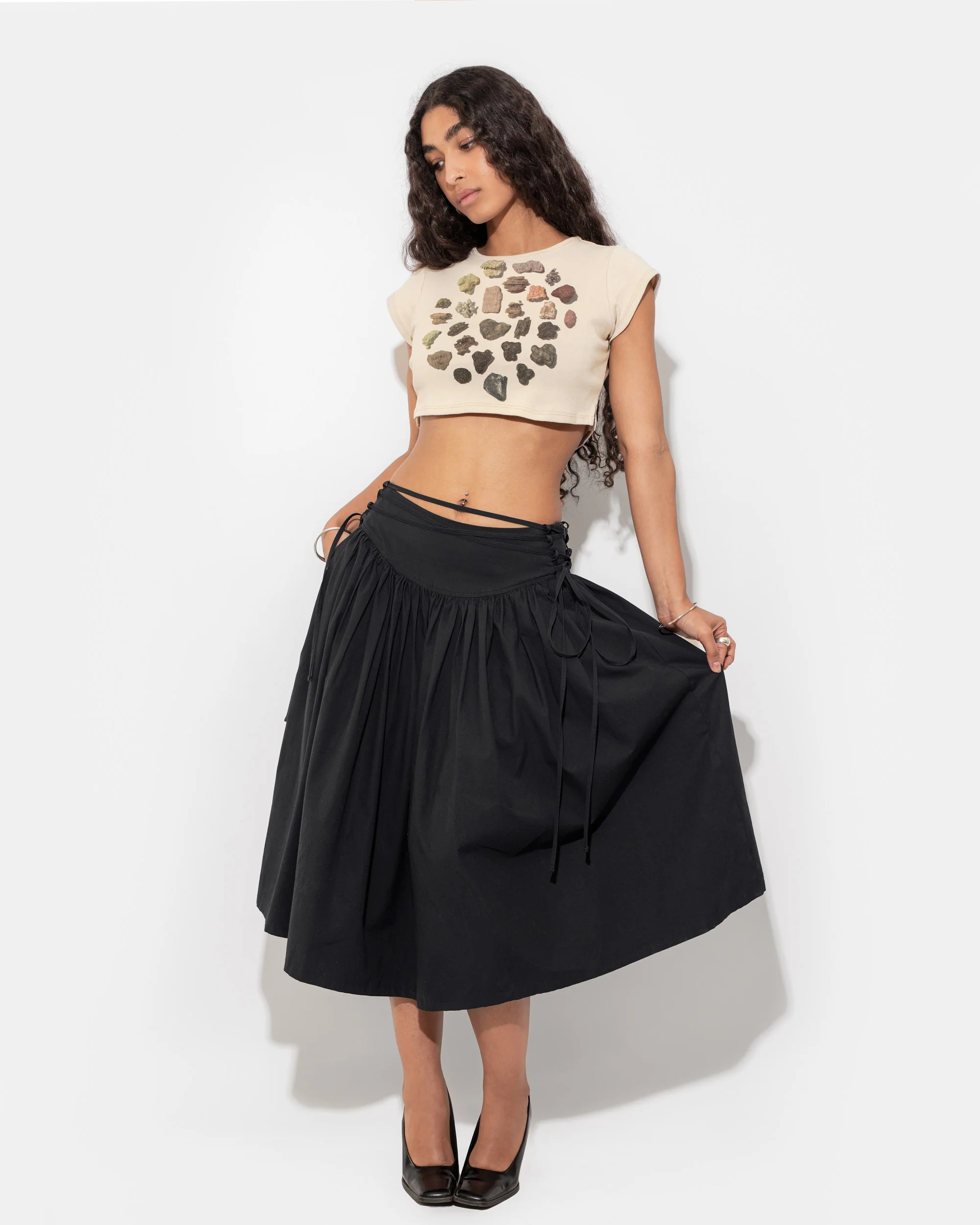Carry with you the stones you arrange on the beach for only the seagulls to see; The Formation Tiny Tee is printed with a subtle spiral of carefully selected stones. In collaboration with artist Cameron Galley, the stone images have been manipulated into otherworldly objects. Tee is fitted and ultra-cropped, designed to fall just below the bust. Made with recycled organic cotton.
