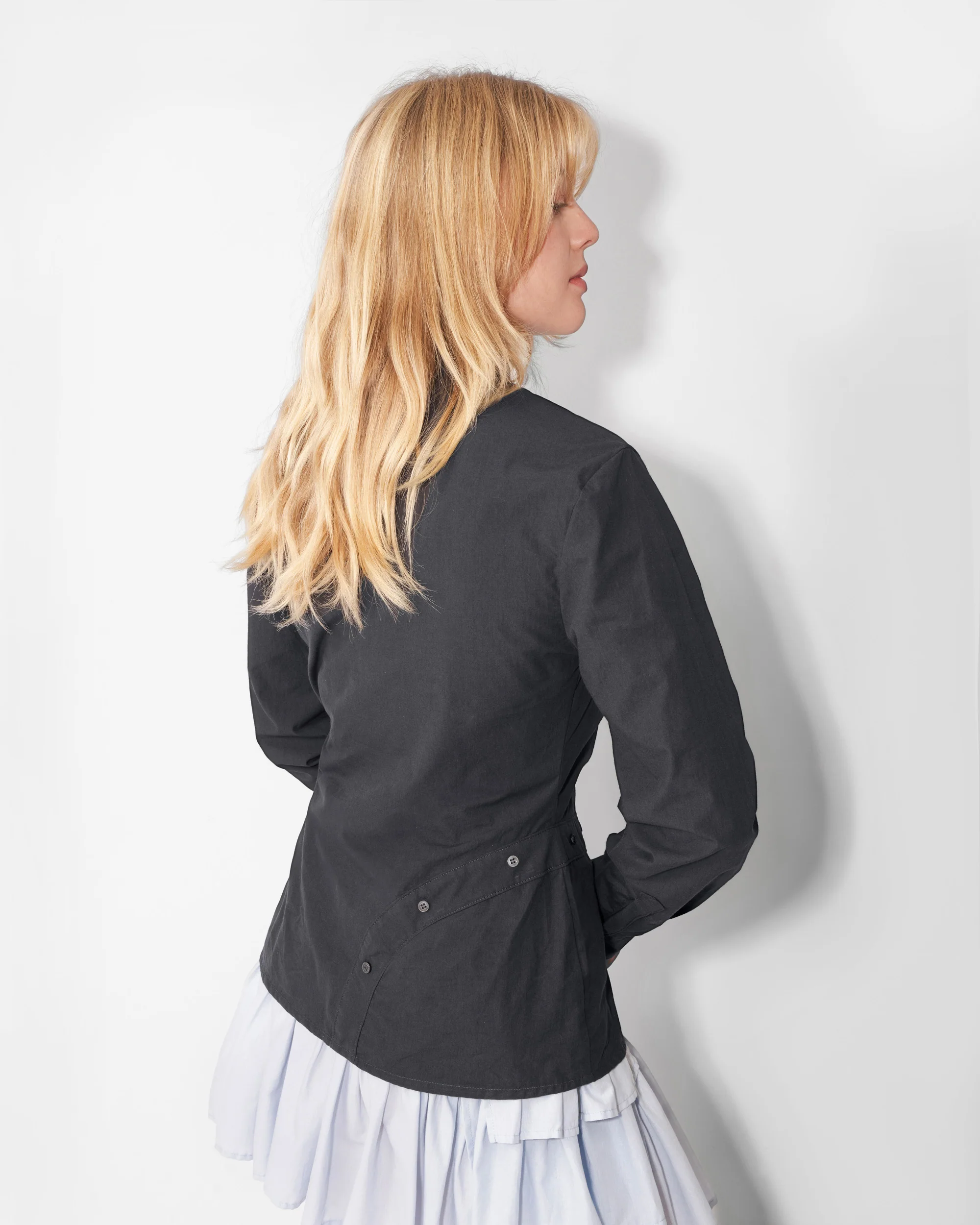 Romantic and timeless, the Meander Button Down is an Ella Mae take on a classic fitted button down. Buttons wind around the waist and down the back of the shirt, meandering like a river. The shirt features an arch-shaped cut out at the hemline for an open, effortless look. Crafted in a beautifully washed charcoal cotton with a bit of structure.