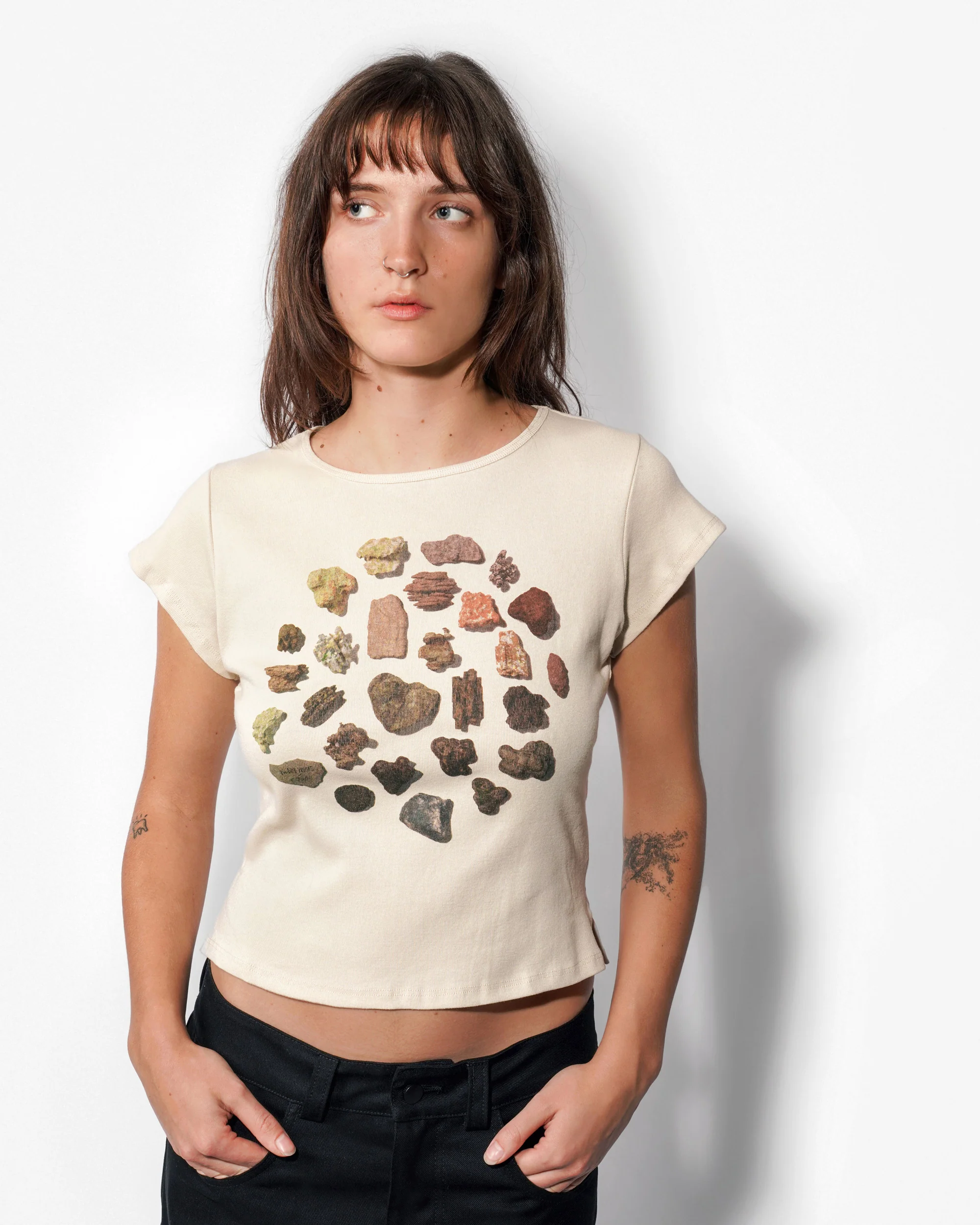 Carry with you the stones you arrange on the beach for only the seagulls to see; The Formation Baby Tee is printed with a subtle spiral of carefully selected stones. In collaboration with artist Cameron Galley, the stone images have been manipulated into otherworldly objects. Tee is fitted and full length, designed to fall just below the belly button. Made with recycled organic cotton.