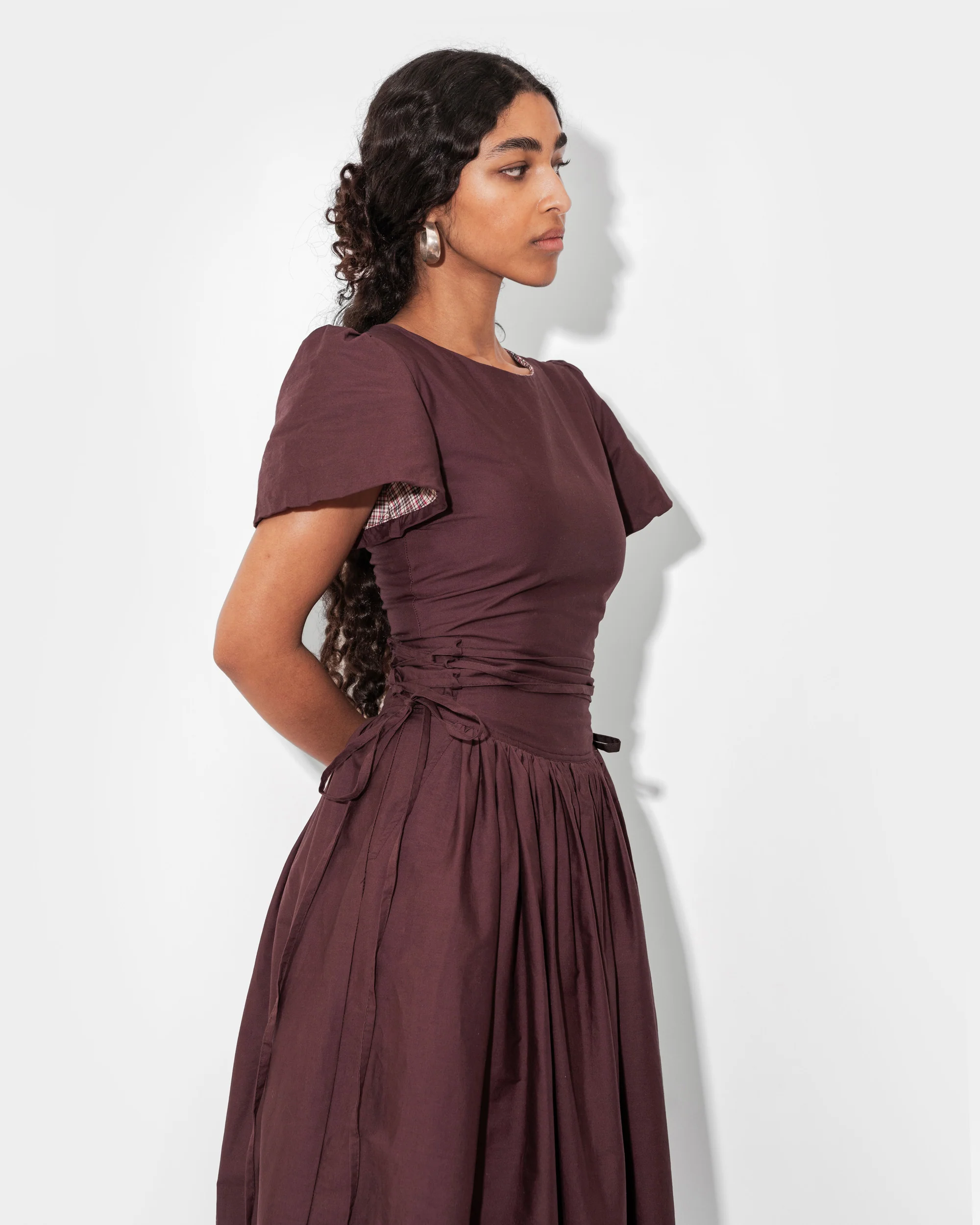 Romanticize each and every day in the Monday Dress. The dress features a fitted bodice with a gently curved waistline, subtly puffed sleeves, and a gathered skirt. Ornamental twisting straps wind, weave, and wrap around the waist and can be tied in a variety of ways. The bodice is fully lined with a matching plaid lining. Dress has two side pockets to hold all your loose ends.