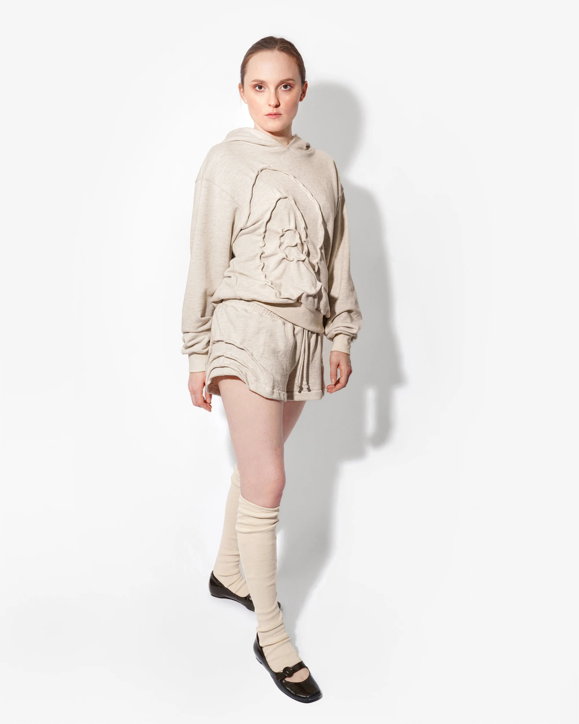 The perfect pair to our Ripple Hoodie, the Ripple Shorts are made from a cozy blue French cotton terry. Our stitching technique gathers the fabric on either side of the shorts, emulating the echo of a ripple and creating a slightly flared silhouette. The shorts have a drawstring waist and a back pocket to carry the special stones you collect while wading in the river.