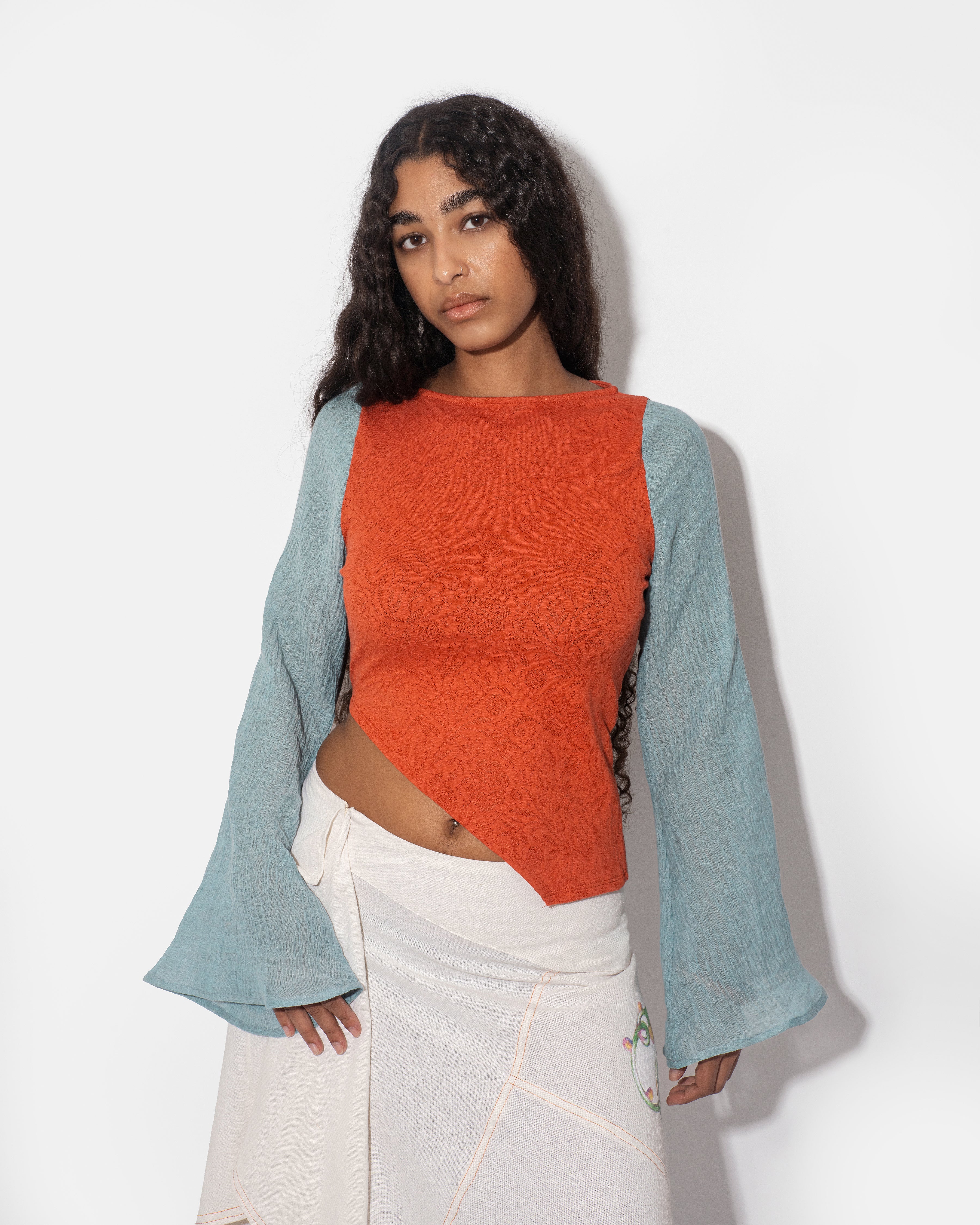 The Santa Fe top, a piece crafted for an autumn spent in the desert. Its body and sleeves are made from contrasting colored and textured fabrics; a stretchy, subtle floral body pairs with light blue gauzy sleeves. It has a boat neck bodice, ocean blue bell sleeves, and an asymmetrical hemline that cuts across the body at an angle.