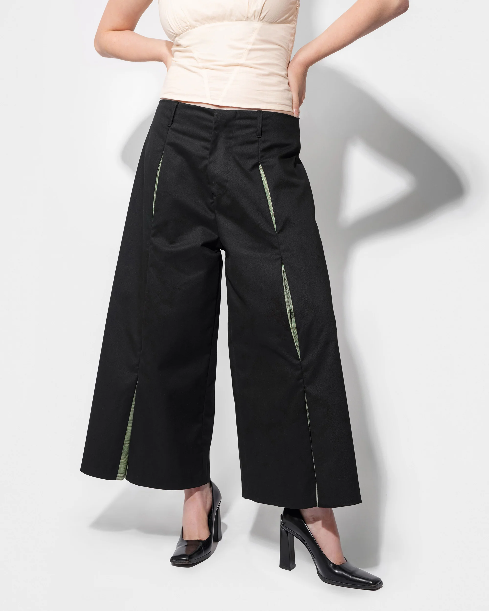 The Sparrow Culottes feature a dual fabric construction and an a-line, wide flared leg. Inverted pleats run down the length of the pant, creating vertical gaps that reveal a secondary green plaid fabric beneath. The gaps move with you, opening and closing to reveal more or less fabric as you shift and flow through your day. The culottes are ankle length, sit just above the hips, and have a spacious wide leg.