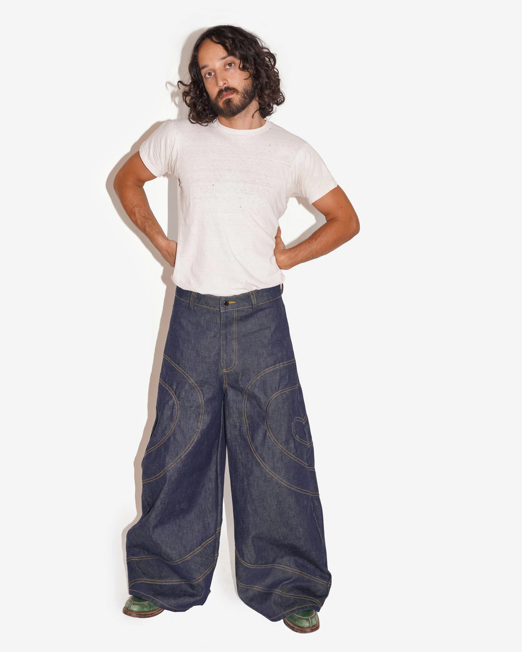 Our classic spiral motif trousers, crafted with love from premium raw Japanese denim. Unwashed and unworn, they’re yours to break in with sweet experiences and fond memories. Features a substantial wide leg, inset spiral emblem, and our Ella Mae logo printed on repurposed leather scraps. Woven with indigo and brown fibers, revealing gentle earthy undertones as the fabric wears.